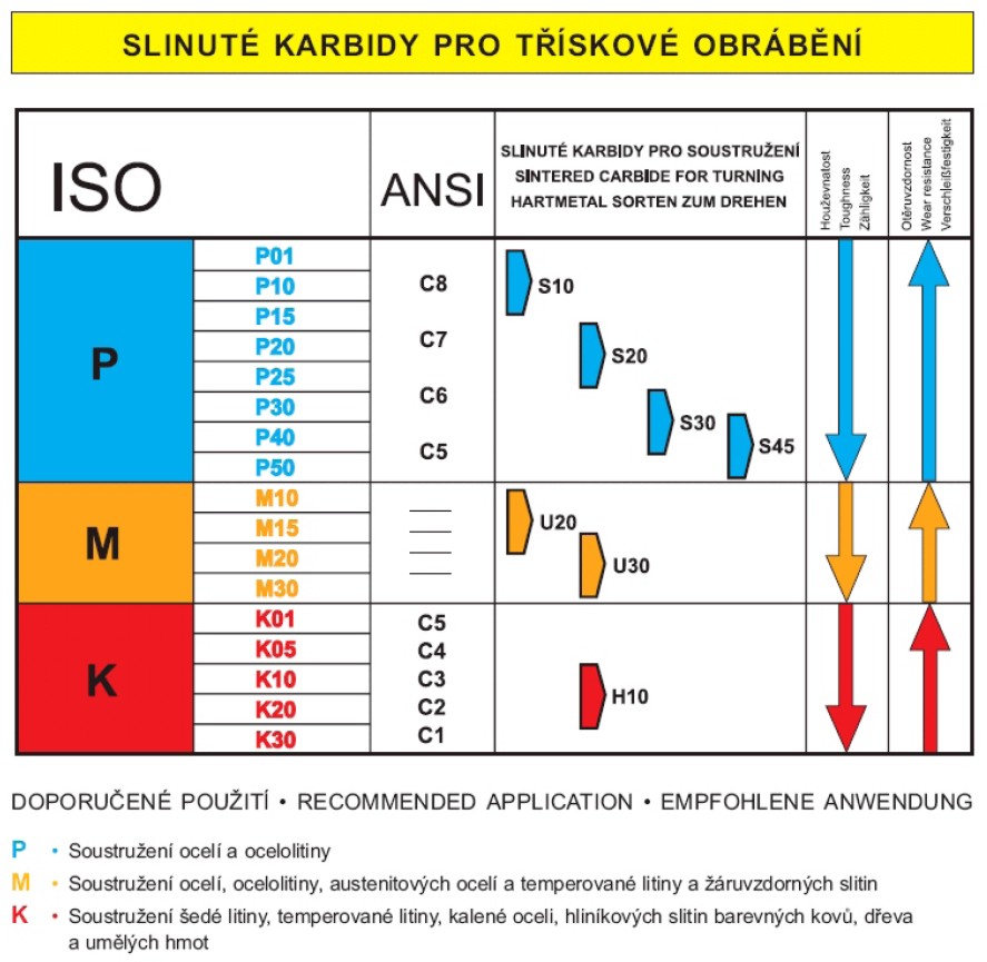 K - Soustružení šedé litiny, temperované litiny, kalené oceli, hliníkových slitin barevných kovů, dřeva a umělých hmot