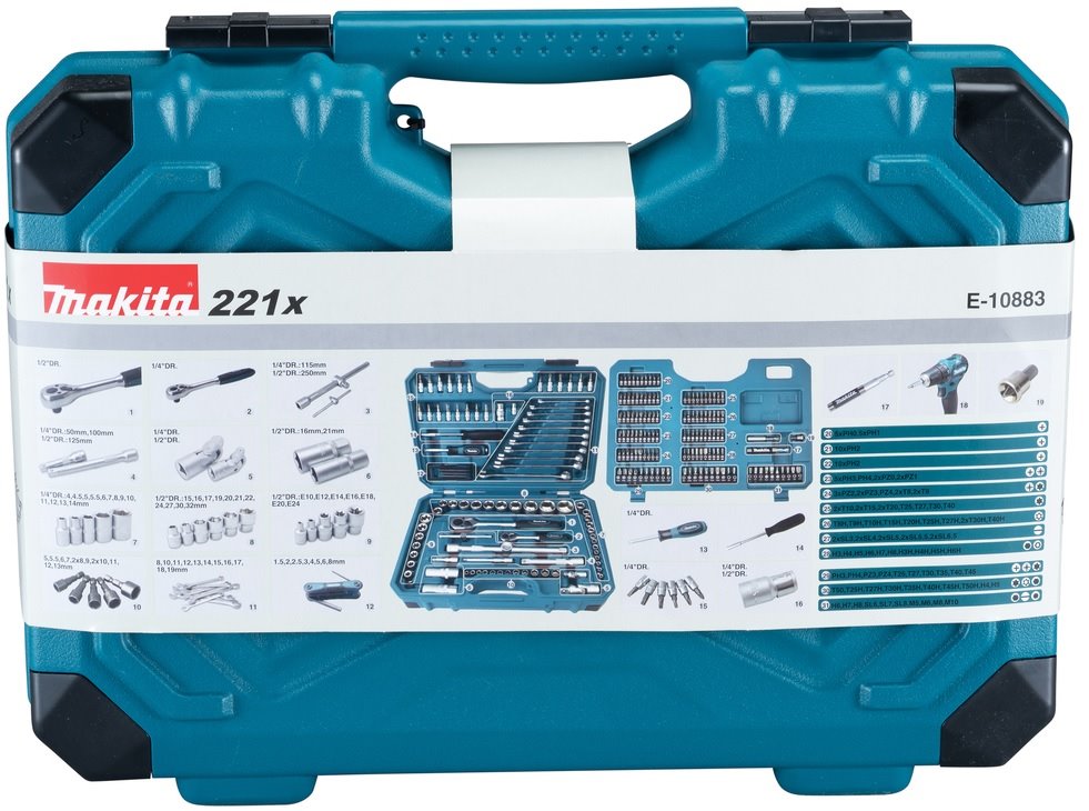 Makita E-10883 - Gola sada nářadí 221-dílná ořechů 1/4" + 1/2", klíčů a bitů v pevném kufru